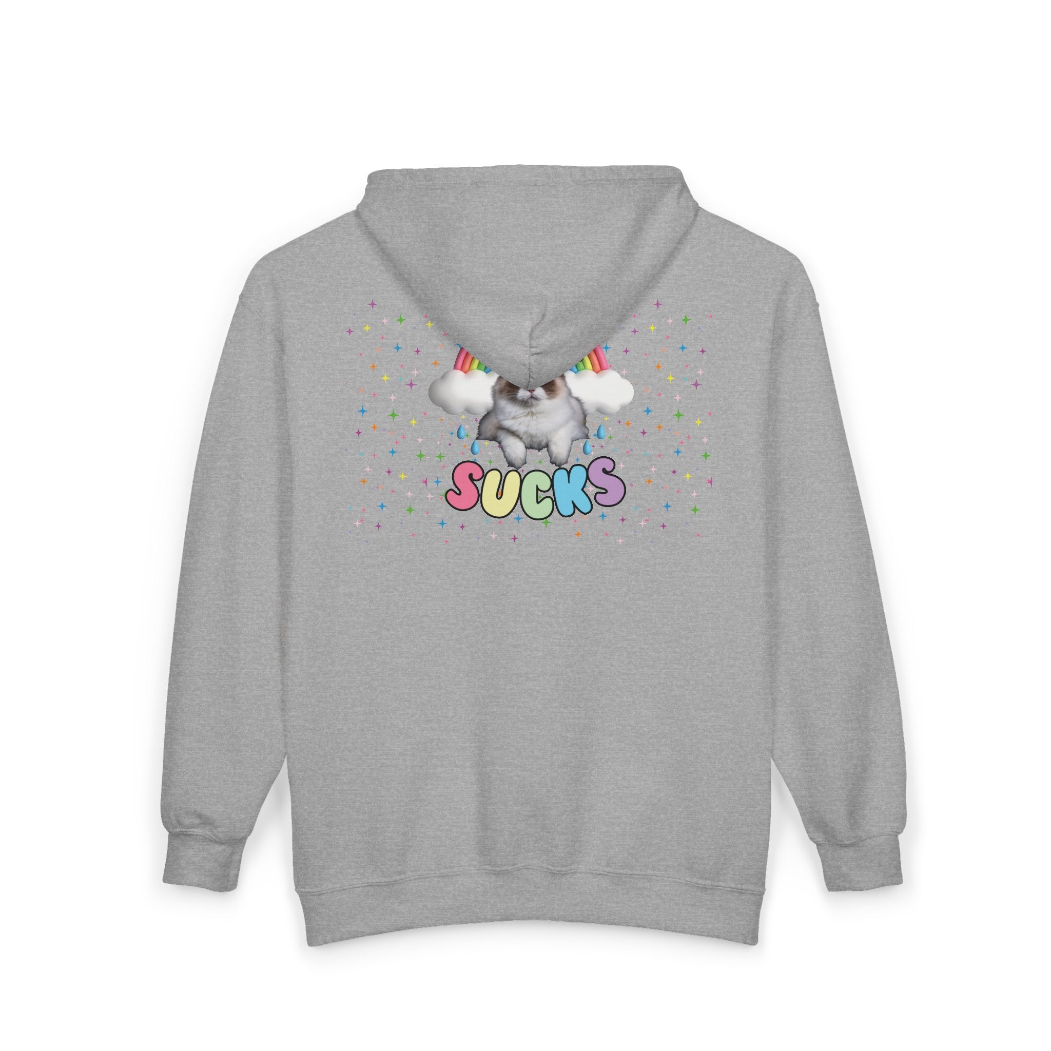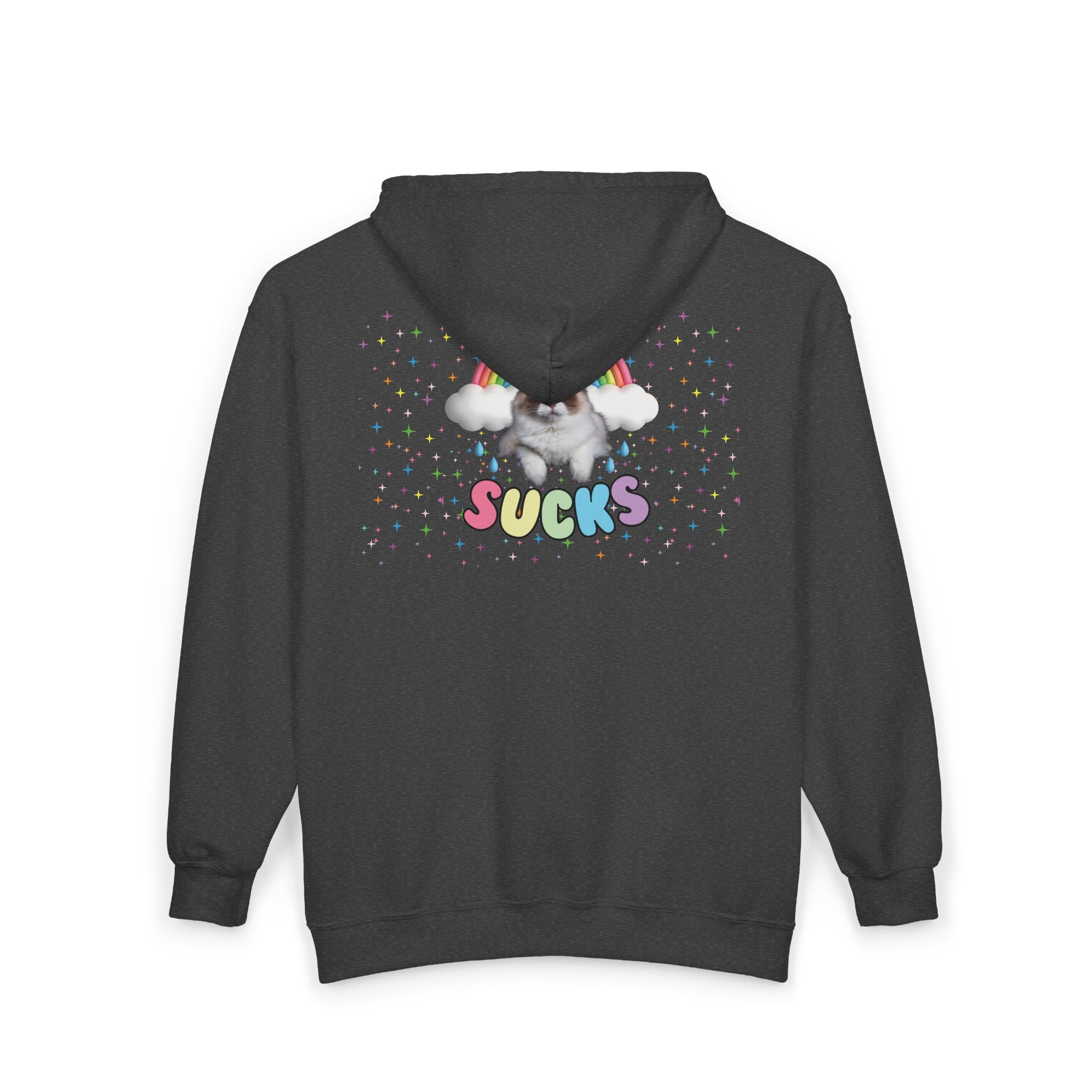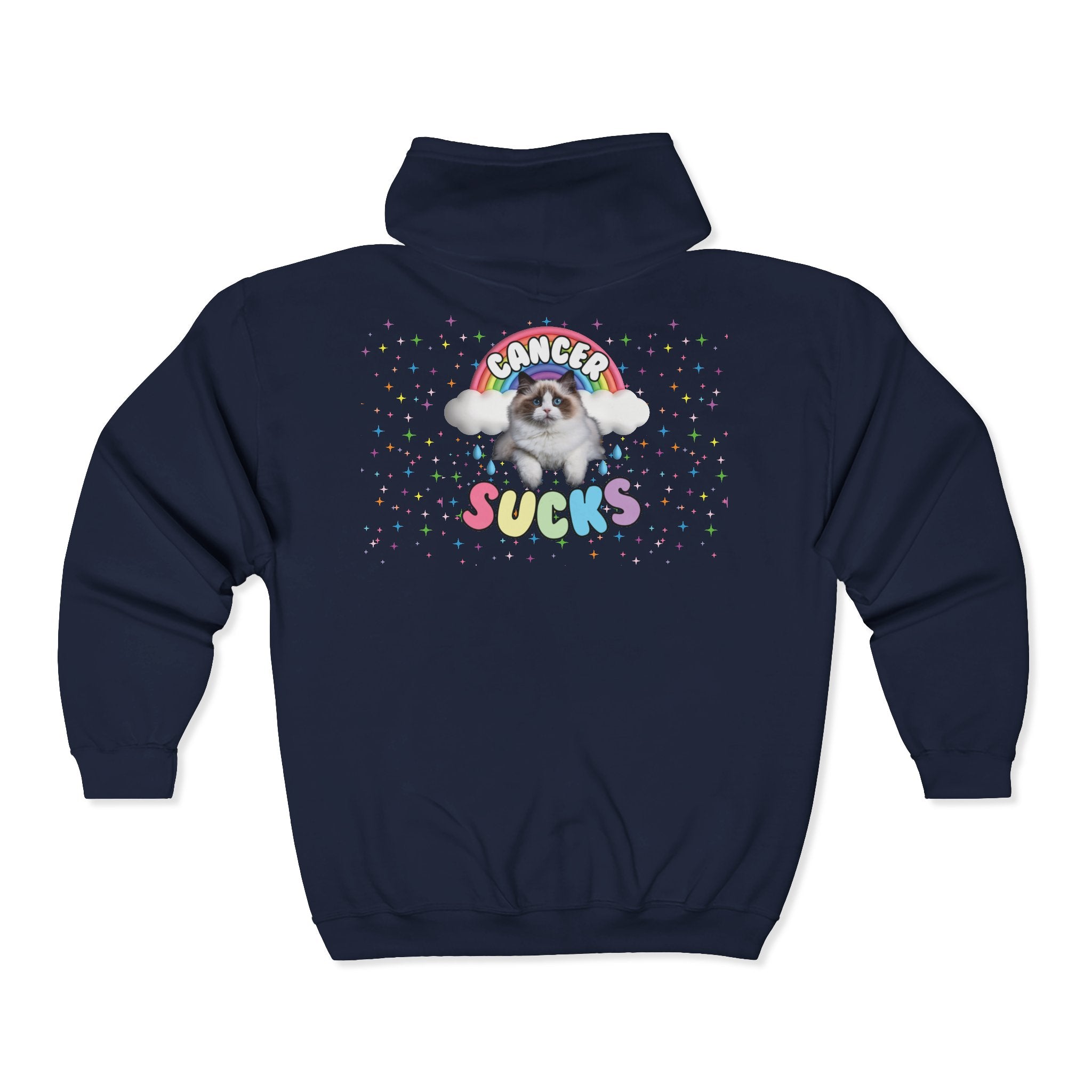 A playful yet powerful design featuring a fierce little cat, twinkling stars, and a vibrant rainbow, with the words “cancer sucks” in bold rainbow colors. It’s a mix of strength, magic, and a little bit of attitude—because even in the toughest times, there’s still light (and maybe a cat or two).