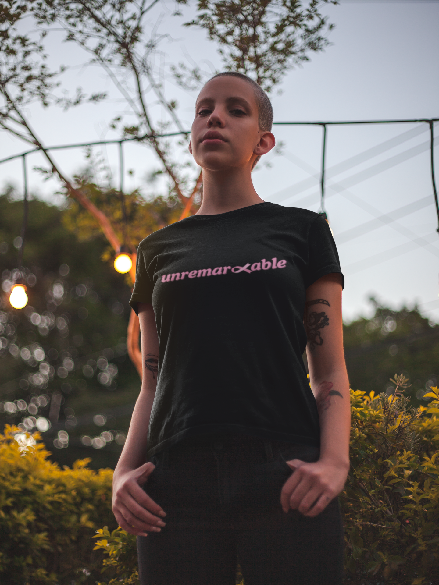 Soft black fabric with clean pink lettering and a subtle strike through — because “unremarkable” isn’t boring.